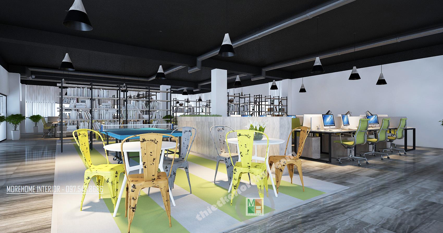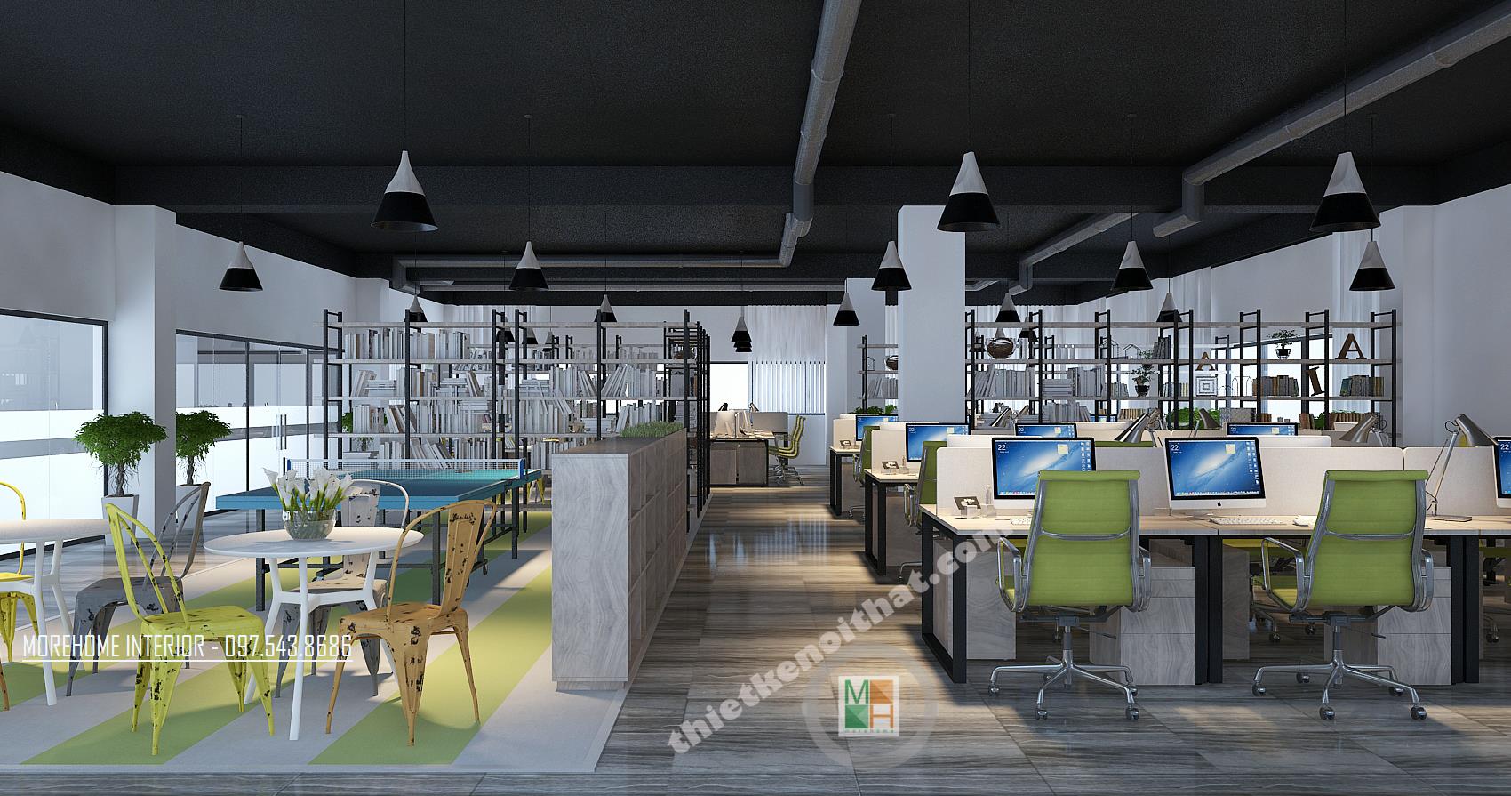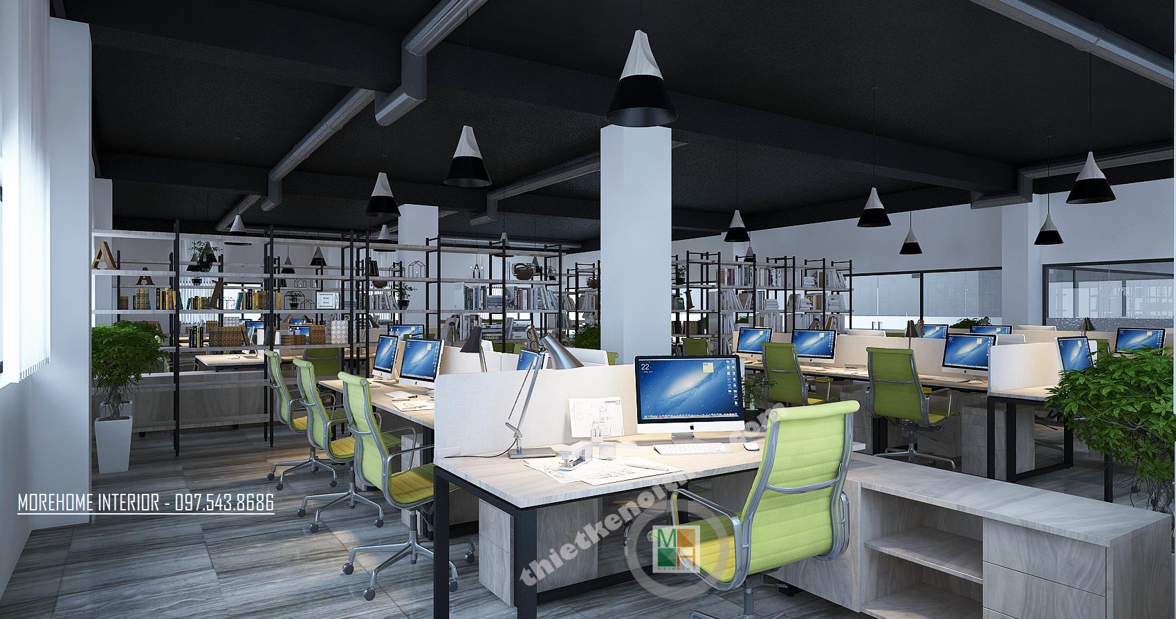 Thiết kế khu phòng làm việc chung với màu sáng như xanh, cam, xám tông màu nhạt mang lại cảm giác nhẹ nhàng và thư giãn. Không gian thiết kế được chia thành các khu riêng biệt, thiết kế đan xen và đối xứng tạo thành một không gian làm việc ngăn nắp. Các kệ tủ được thiết kế đan xen tạo thành không gian tiện nghi và thoải mái. Với không gian khu làm việc, nơi cần sư tương tác và hỗ trợ lẫn nhau, kiến trúc sư đã khéo léo sử dụng những kệ tủ thấp, thoáng tạo không gian liên kết giữa các khu riêng biệt, từ đó mang đến cảm giác thoải mái và nâng cao hiệu quả trong giao tiếp, chia sẽ thông tin. Vật liệu được sử dụng trong thiết kế hầu hết là các vật liệu nhẹn như gỗ, inox, gỗ ép… vừa đảm bảo tính thẩm mỹ, công năng mà lại dễ dàng và linh hoạt trong việc di chuyển và sắp xếp. Ánh sáng là một trong những yếu tố vô cùng quan trọng trong thiết kế, và đặc biệt là tại nơi làm việc. Chính vì vậy thiết kế cửa sổ được chú trọng hơn cả, khung cửa mở giúp tận dụng tối đa ánh sáng tự nhiên và tiết kiệm điện năng cho văn phòng. Đèn chiếu sáng bố trí hợp lý với kiểu dáng cách tân sáng tạo tạo tránh sự nhàm chán và đơn điệu cho căn phòng. Bên cạnh đó, các không gian nghỉ đan xen với không gian làm việc tạo cảm giác cân bằng và hài hòa. Thiết kế cũng chú trọng đến không gian xanh khi điểm xuyết các tông xanh tự nhiên hay các chậu cây nhỏ ở các góc phòng giúp giảm bớt sự bí bách và thúc đẩy sáng tạo, niềm hứng khởi trong công việc.
