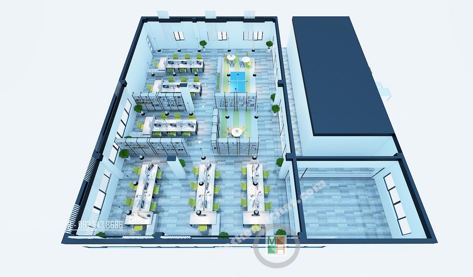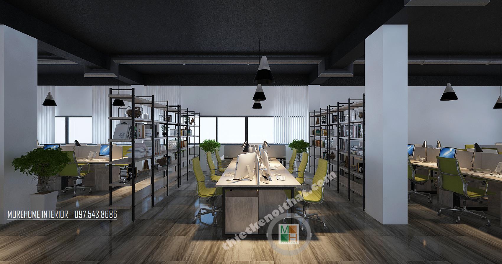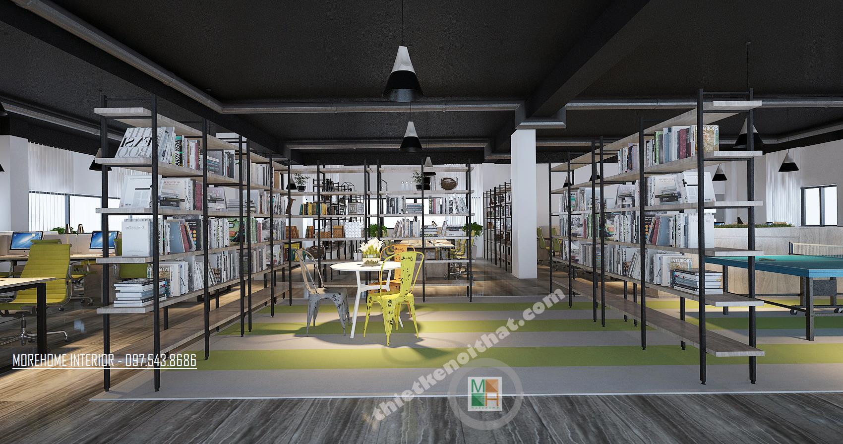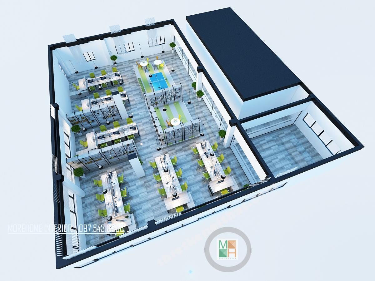 Thiết kế khu phòng làm việc chung với màu sáng như xanh, cam, xám tông màu nhạt mang lại cảm giác nhẹ nhàng và thư giãn. Không gian thiết kế được chia thành các khu riêng biệt, thiết kế đan xen và đối xứng tạo thành một không gian làm việc ngăn nắp. Các kệ tủ được thiết kế đan xen tạo thành không gian tiện nghi và thoải mái. Với không gian khu làm việc, nơi cần sư tương tác và hỗ trợ lẫn nhau, kiến trúc sư đã khéo léo sử dụng những kệ tủ thấp, thoáng tạo không gian liên kết giữa các khu riêng biệt, từ đó mang đến cảm giác thoải mái và nâng cao hiệu quả trong giao tiếp, chia sẽ thông tin. Vật liệu được sử dụng trong thiết kế hầu hết là các vật liệu nhẹn như gỗ, inox, gỗ ép… vừa đảm bảo tính thẩm mỹ, công năng mà lại dễ dàng và linh hoạt trong việc di chuyển và sắp xếp. Ánh sáng là một trong những yếu tố vô cùng quan trọng trong thiết kế, và đặc biệt là tại nơi làm việc. Chính vì vậy thiết kế cửa sổ được chú trọng hơn cả, khung cửa mở giúp tận dụng tối đa ánh sáng tự nhiên và tiết kiệm điện năng cho văn phòng. Đèn chiếu sáng bố trí hợp lý với kiểu dáng cách tân sáng tạo tạo tránh sự nhàm chán và đơn điệu cho căn phòng. Bên cạnh đó, các không gian nghỉ đan xen với không gian làm việc tạo cảm giác cân bằng và hài hòa. Thiết kế cũng chú trọng đến không gian xanh khi điểm xuyết các tông xanh tự nhiên hay các chậu cây nhỏ ở các góc phòng giúp giảm bớt sự bí bách và thúc đẩy sáng tạo, niềm hứng khởi trong công việc.