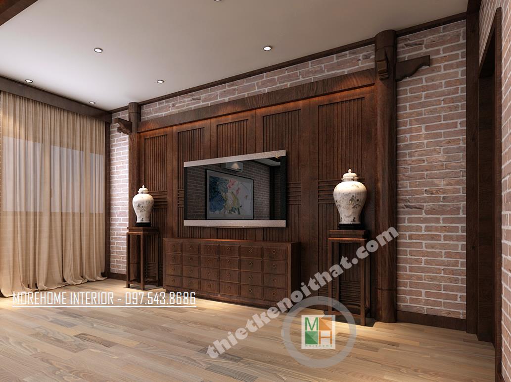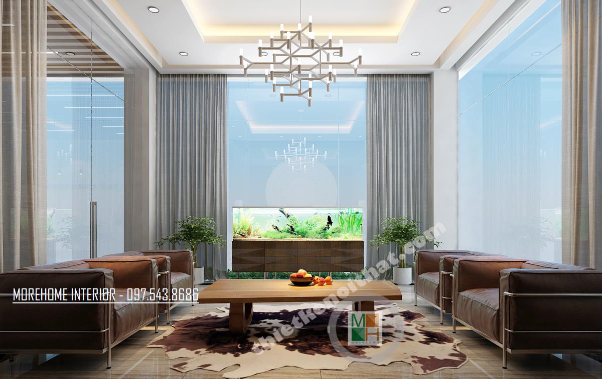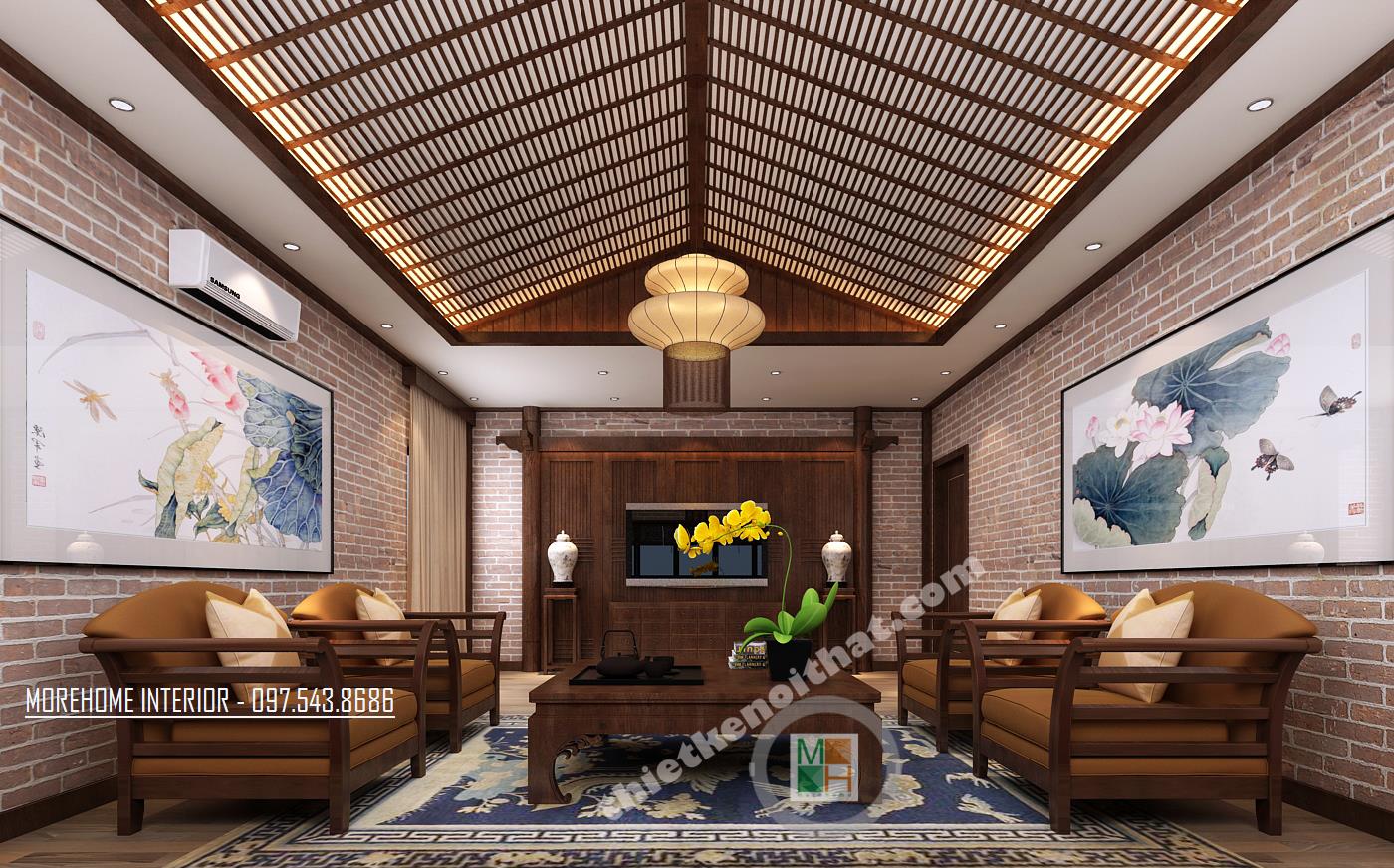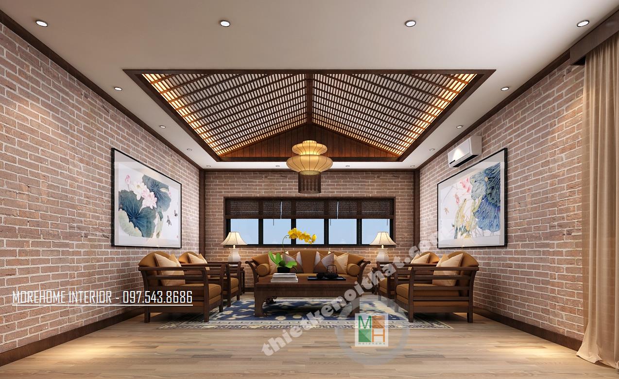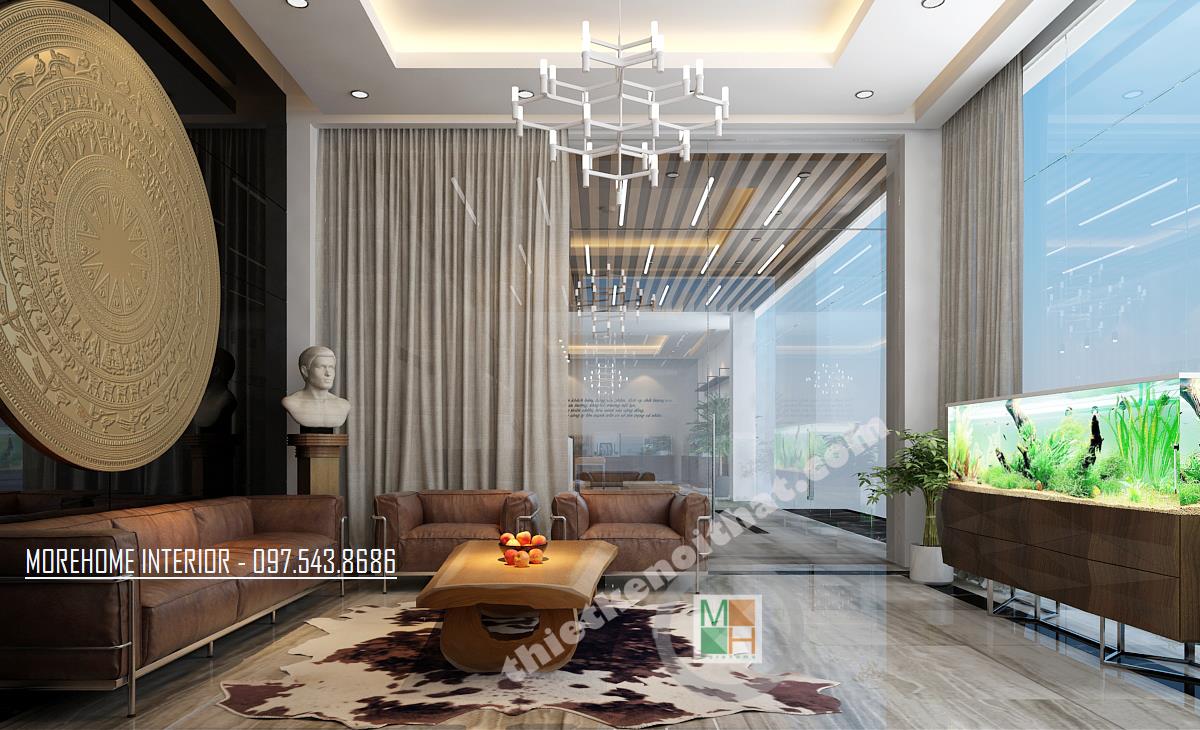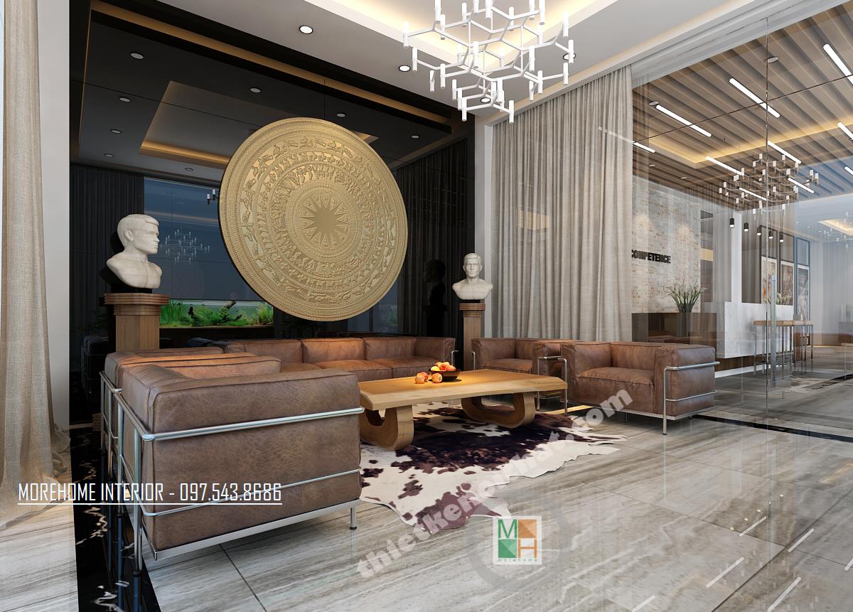 Thiết kế phòng tiếp khách tại sảnh mang phong cách khá trang trọng và truyền thống. Tông màu được sử dụng là tông màu nâu trầm tạo cảm giác đơn giản, gần gũi. Không gian được thiết kế đối xứng qua hình ảnh chiếc trống đồng to và rộng đặt ở vị trí trung tâm. Khung cửa kính được thiết kế rộng đón ánh sáng tự nhiên vào căn phòng. Độ tương phản từ các thiết kế kính, hay tường mang đến một không gian khá mở, tạo độ thoáng cho căn phòng. Đây quả là một thiết kế không quá cầu kỳ nhưng lại đem lại hiệu quả lớn về thẩm mỹ và công năng, tạo cảm giác dễ chịu cho các vị khách.
