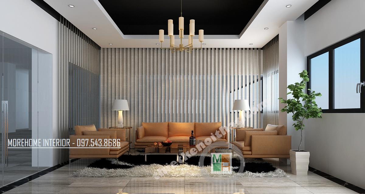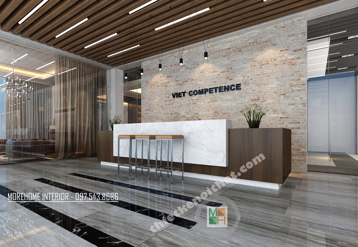 Thiết kế khu lễ tân với phong cách hiện đại, đơn giản, nổi bật là thiết kế thương hiệu nổi bật tạo điểm nhấn cho khách khi bước vào. Thiết kế hình ảnh tường thô khá lạ mắt giúp không gian không bị nhàm chán và đơn điệu. Vật liệu nhẹ như gỗ ép vẫn được tận dụng mang đến một không gian gặp gỡ sang trọng và hiện đại.