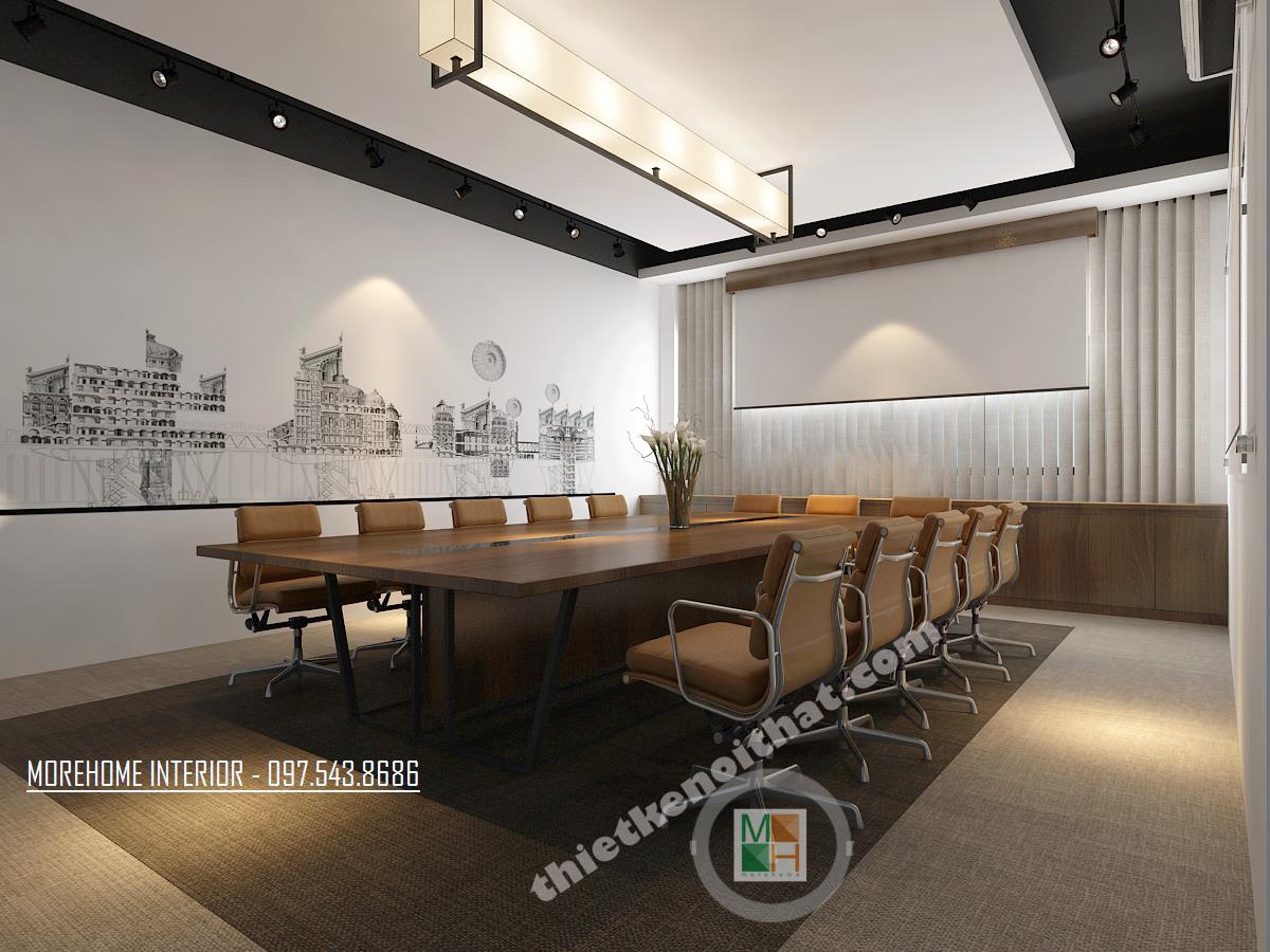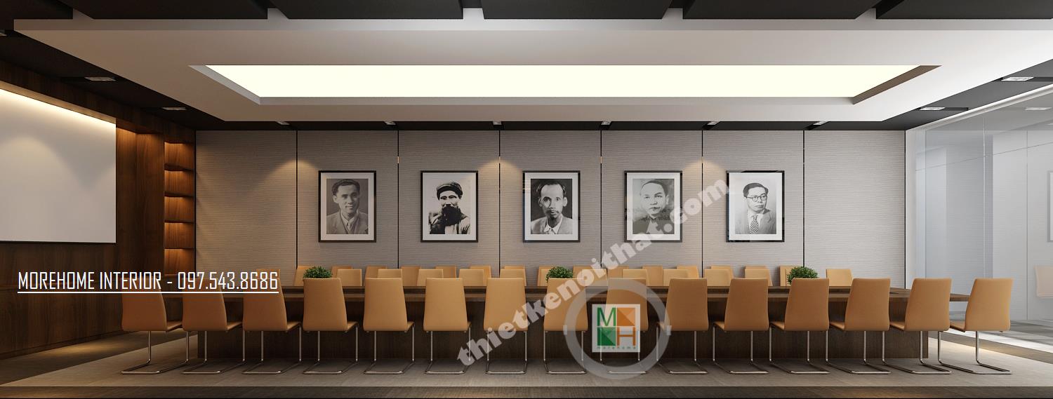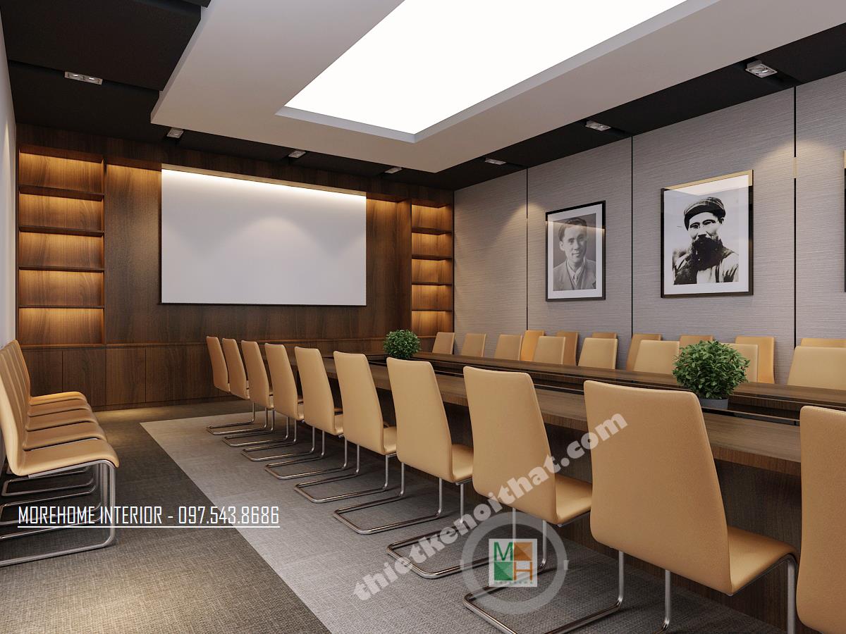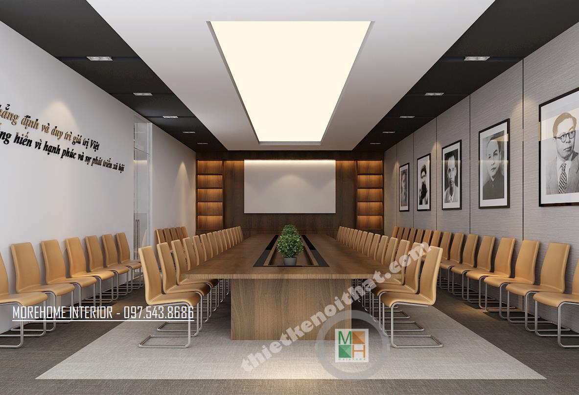 Thiết kế phòng họp lớn hiện đại mang lại sự thoải mái và tiện nghi. Tông màu thiết kế đơn giản với các màu trung tính như xám ghi và vàng veneer nhạt. Thiết kế bàn dài tạo cảm giác kéo dài diện tích cho căn phòng. Các thiết kế tường được cách tân bằng các bức tranh thể hiện truyền thống và tinh thần dân tộc. Thiết kế được điểm xanh bằng các chậu cây nhỏ được đặt ngay ngắn trên bàn.