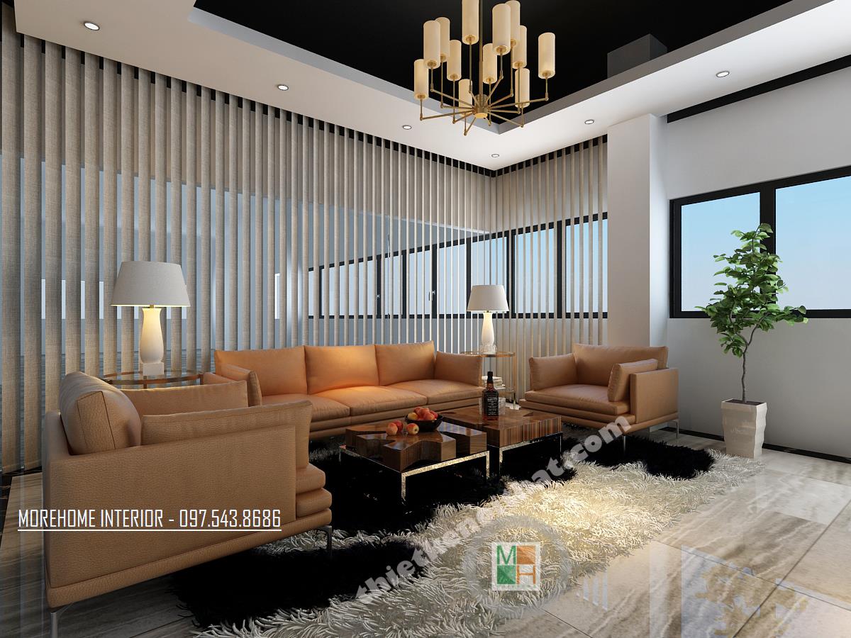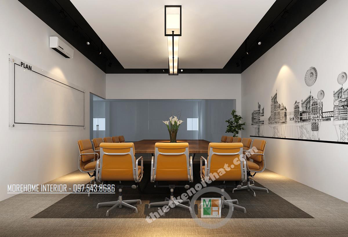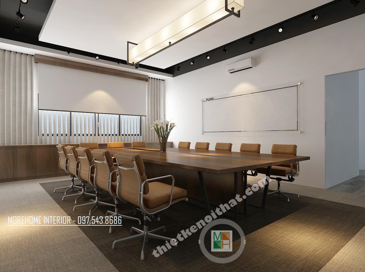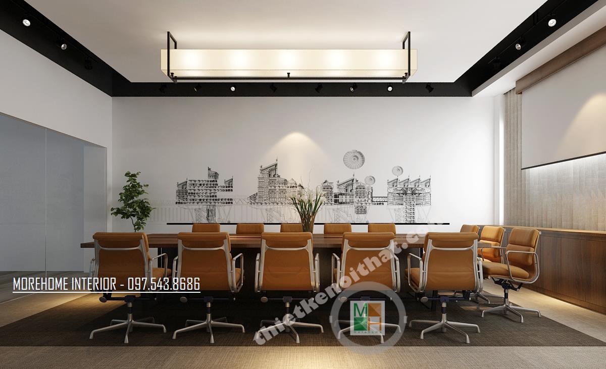Thiết kế phòng họp lớn hiện đại mang lại sự thoải mái và tiện nghi. Tông màu thiết kế đơn giản với các màu trung tính như xám ghi và vàng veneer nhạt. Thiết kế bàn dài tạo cảm giác kéo dài diện tích cho căn phòng. Các thiết kế tường được cách tân bằng các bức tranh thể hiện truyền thống và tinh thần dân tộc. Thiết kế được điểm xanh bằng các chậu cây nhỏ được đặt ngay ngắn trên bàn.
