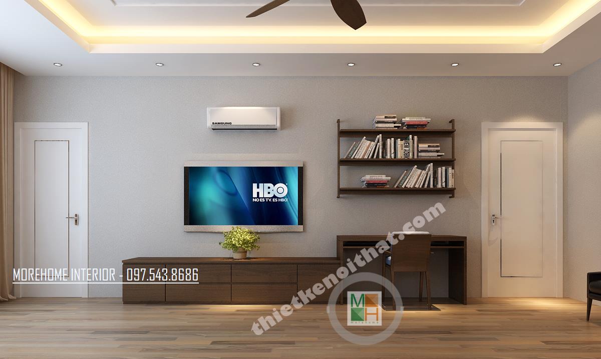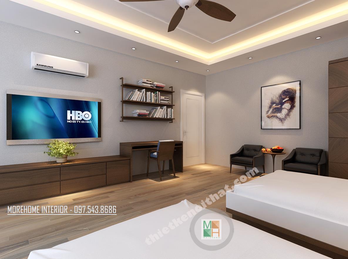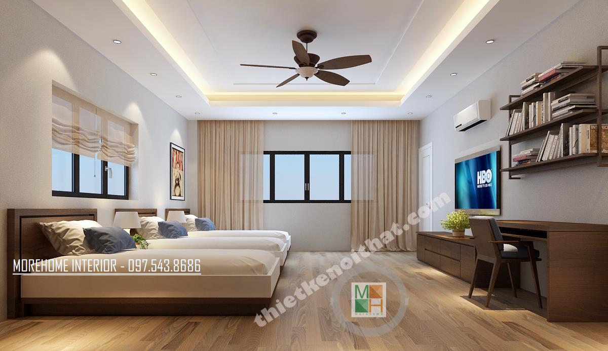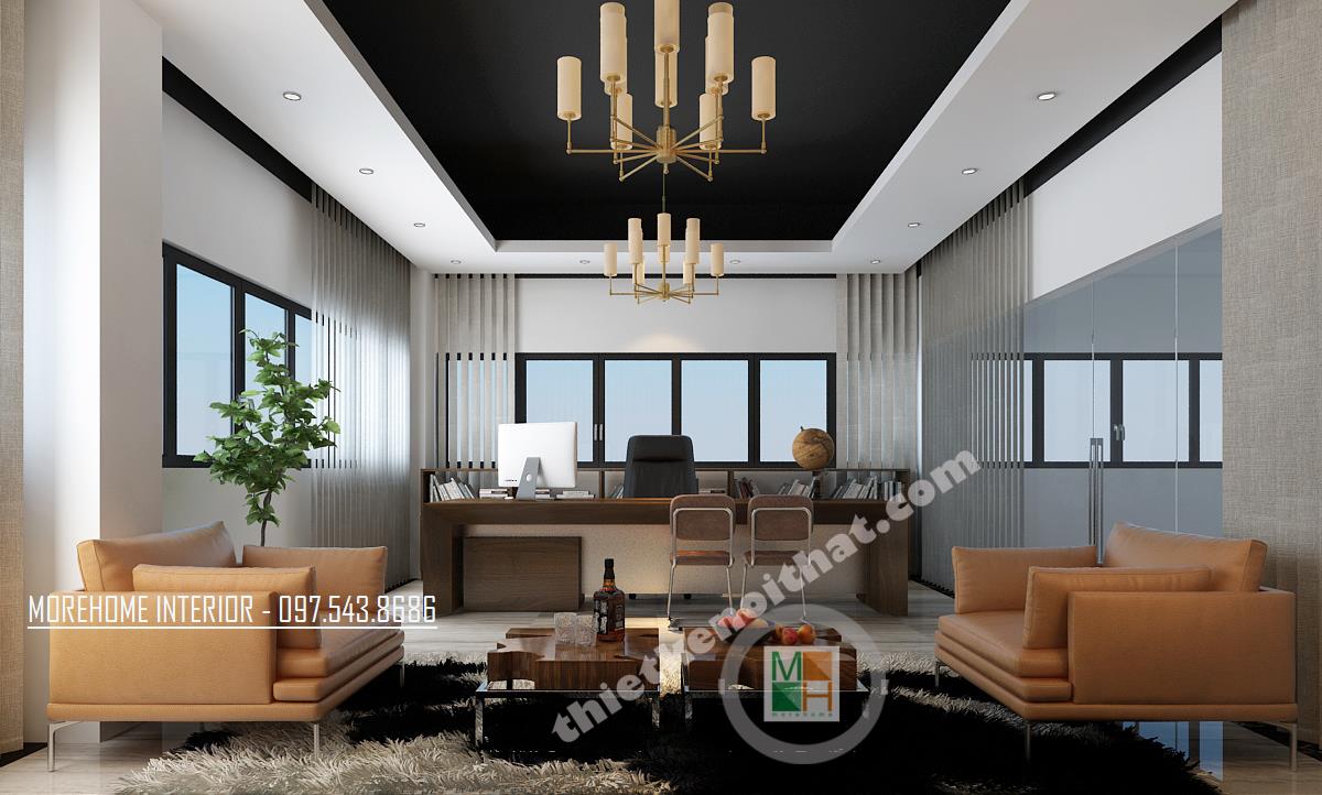 Thiết kế phòng làm việc giám đốc với hệ thống cửa sổ mang lại ánh sáng tự nhiên cho cả căn phòng. Tủ sách thiết kế khéo léo ngay phía cửa sổ mang đến sự tiện nghi mà không tốn nhiều diện tích. Thiết kế bàn làm việc đơn giản, không quá cầu kỳ với tông màu nâu trầm đặc trưng của gỗ mang lại vẻ quý phái cho căn phòng.