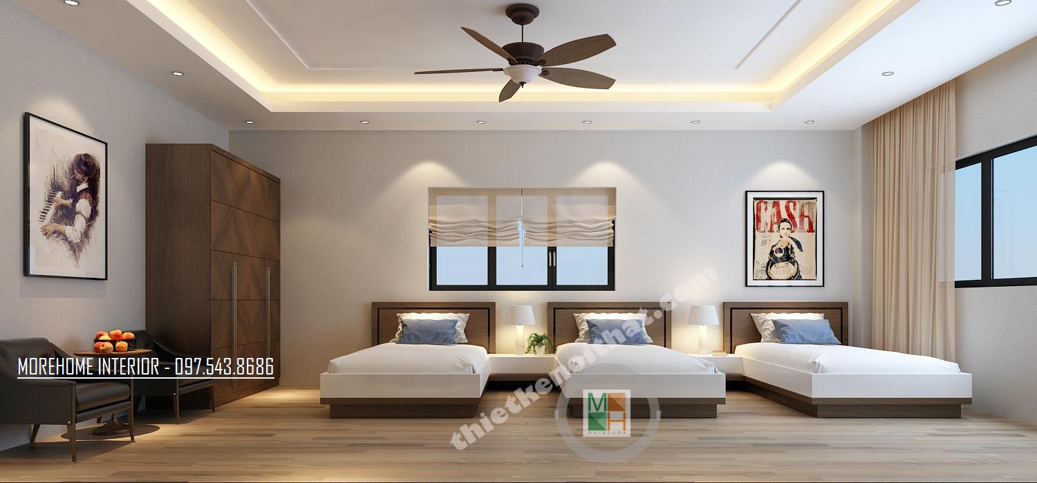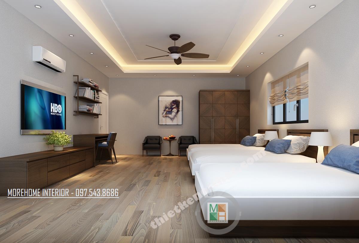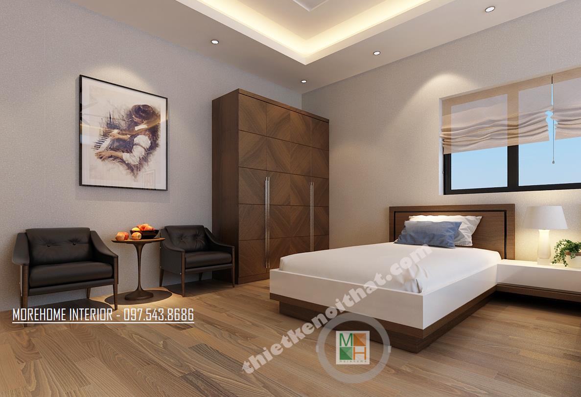 Thiết kế phòng làm việc giám đốc với hệ thống cửa sổ mang lại ánh sáng tự nhiên cho cả căn phòng. Tủ sách thiết kế khéo léo ngay phía cửa sổ mang đến sự tiện nghi mà không tốn nhiều diện tích. Thiết kế bàn làm việc đơn giản, không quá cầu kỳ với tông màu nâu trầm đặc trưng của gỗ mang lại vẻ quý phái cho căn phòng.