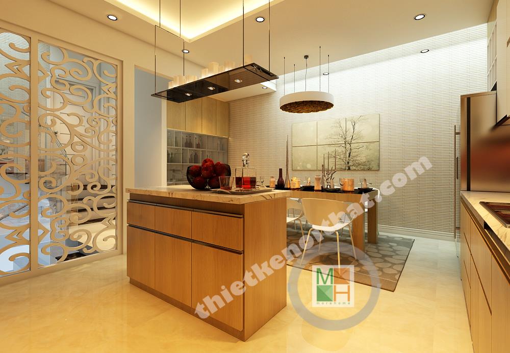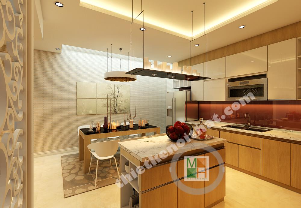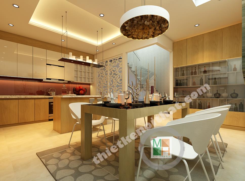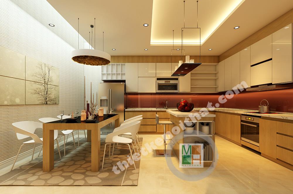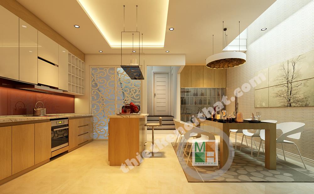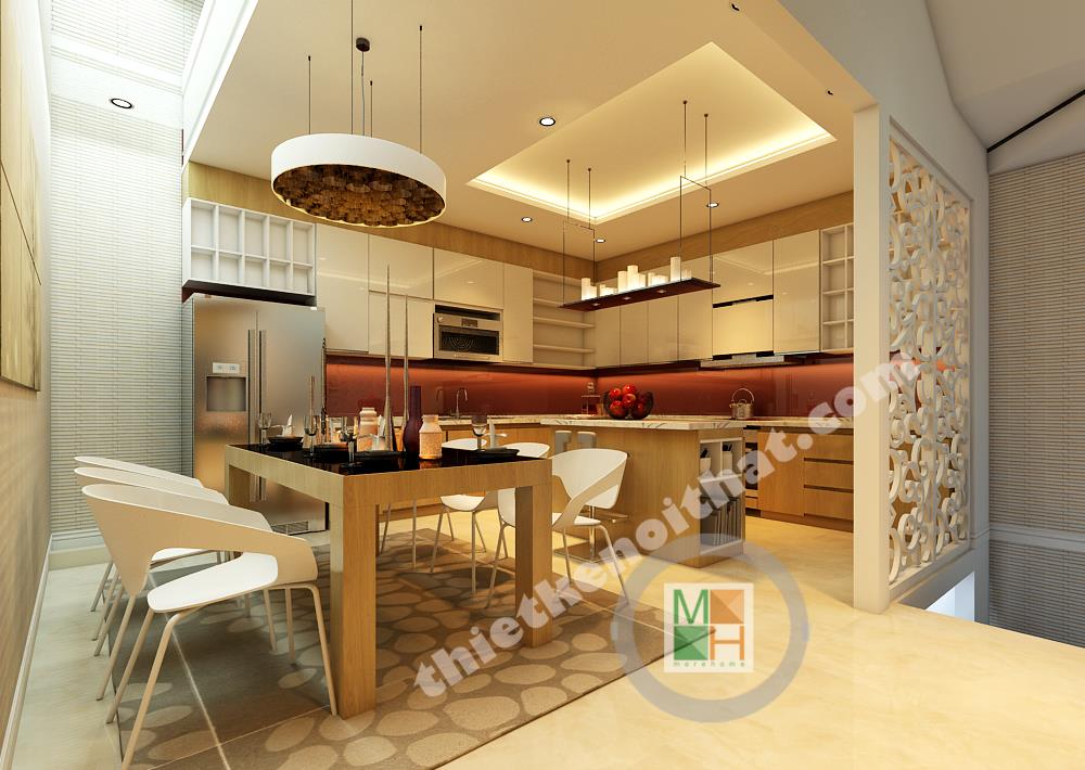 Không gian sinh hoạt của gia đình bao gồm bếp, hai phòng ngủ, phòng giải trí và phòng thờ. Căn bếp của ngôi nhà sử dụng ánh sáng vàng từ hệ thống đèn để tạo cảm giác ấm cúng. Bàn ăn được đặt ngay trong phòng để tiện cho việc bưng bê. Những chiếc ghế ăn cách điệu màu trắng vừa đẹp mắt lại rất cơ động khi di chuyển chỗ ngồi. Có thể trang trí thêm cho khu vực này bằng một bức tranh treo tường với chủ đề phong cảnh để tạo thêm không khí vui vẻ. Chiếc bàn đảo được tận dụng làm quầy bar để gia chủ có thể ngồi uống rượu. Tủ bếp trên dưới tương ứng với hai màu trắng, nâu tạo cảm giác sáng sủa và sạch sẽ.