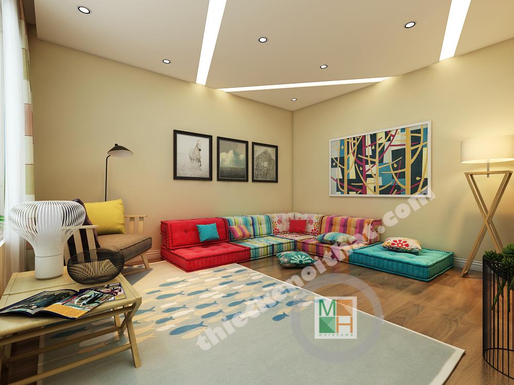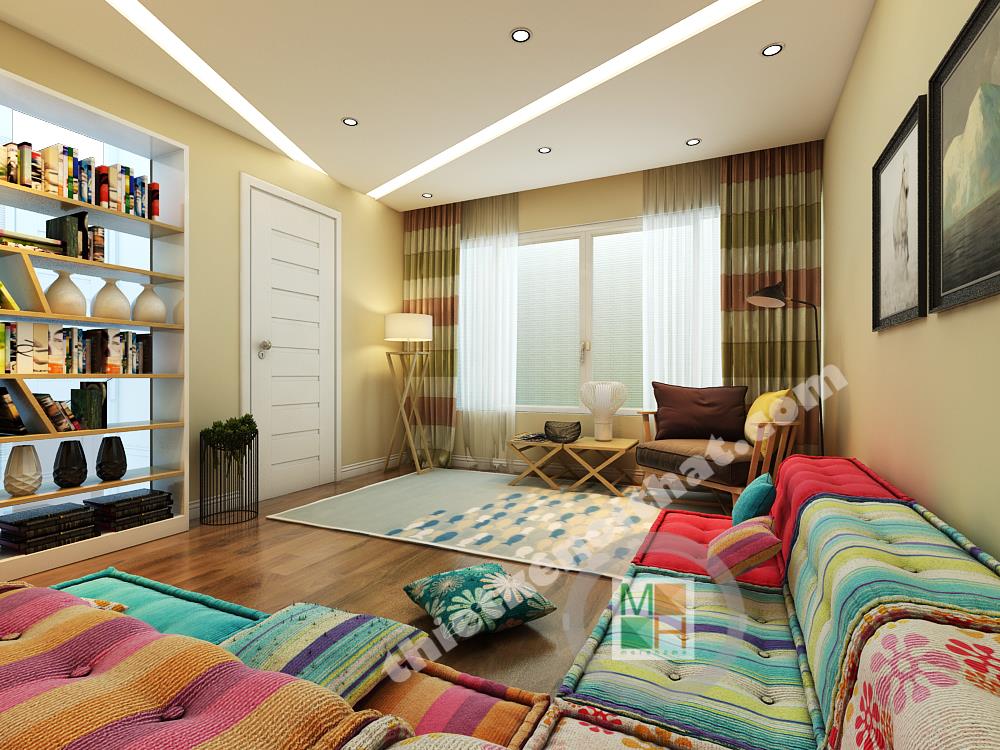 Phòng giải trí của gia đình được thiết kế như một sân chơi cho các con. Bộ ghế nhiều màu sắc như những miếng xếp hình khơi gợi sự sáng tạo của con trẻ. Giá sách lớn giúp việc phân loại sách, truyện dễ dàng hơn. Bộ bàn ghế nhỏ dưới ô cửa sổ thì lại phù hợp cho ba, mẹ ngồi đọc báo và uống café vào buổi sáng.