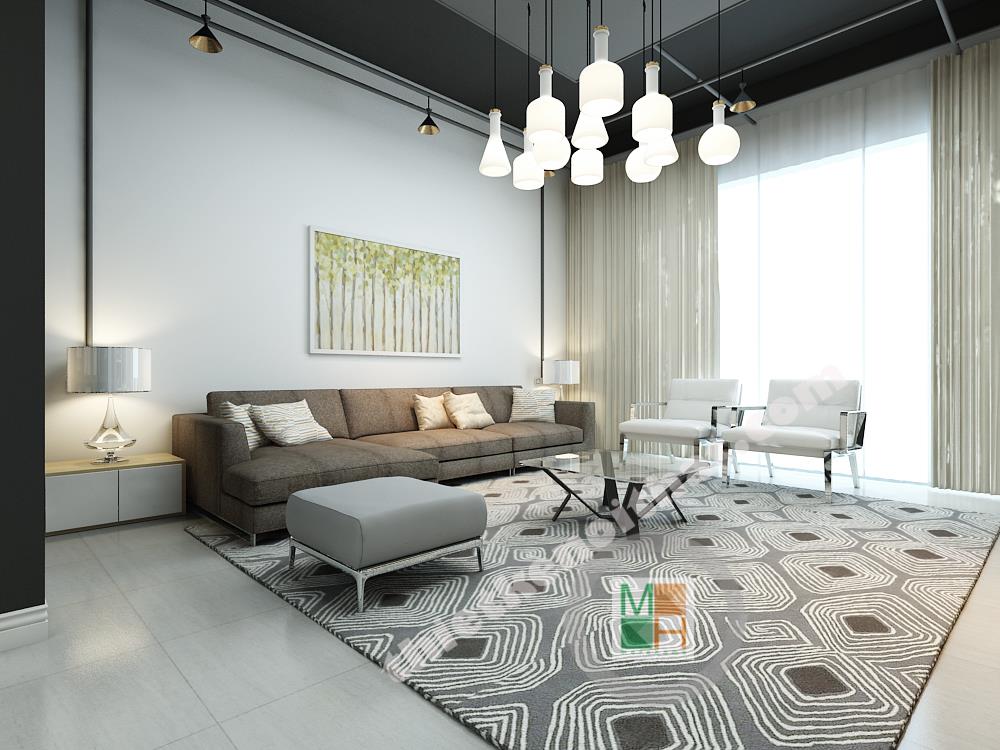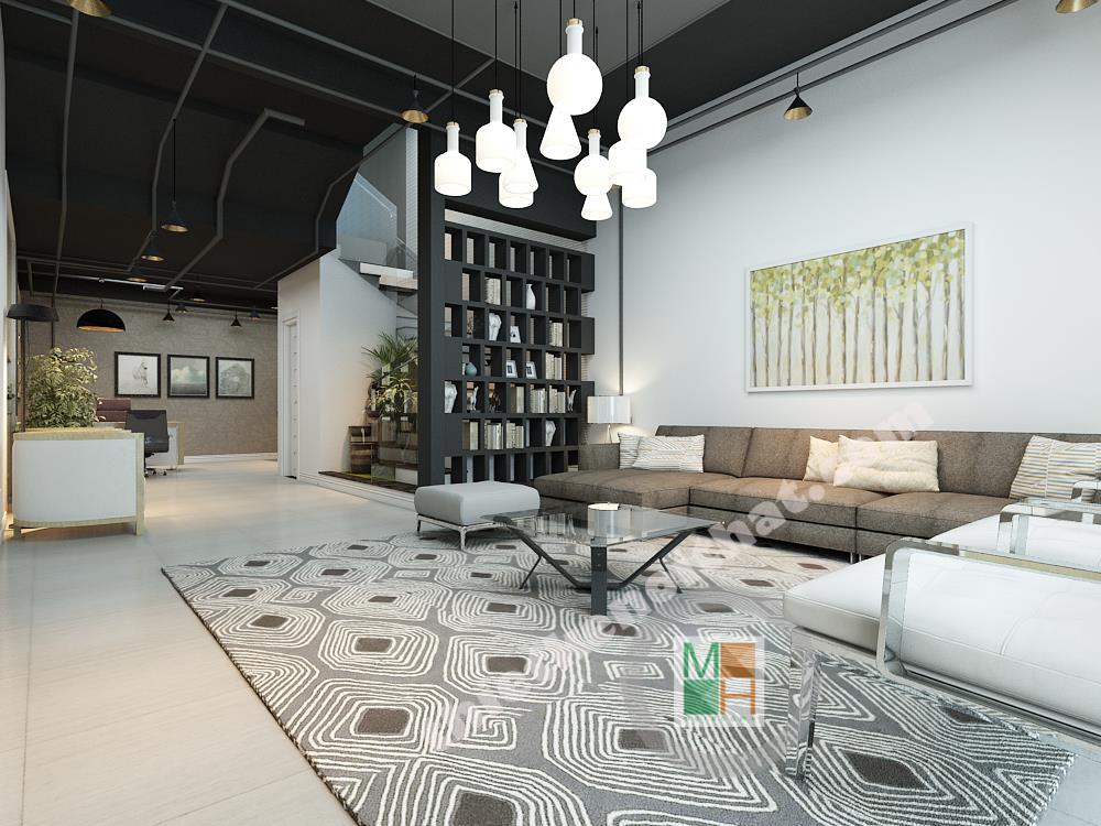 Tầng 1 vẫn được sử dụng làm phòng khách nhưng ở bên trong lại là văn phòng làm việc cho nhân viên. Ba màu được sử dụng nhiều nhất ở tầng 1 là đen, trắng và nâu tạo ra sự đan xen màu sắc nổi bật. Nhờ cánh cửa kính nên phòng khách trông rất rộng và thoáng. Chiếc sofa dài màu nâu đi kèm với ghế nhỏ màu trắng rất hiện đại và ấm cúng. Chiếc giá sách ngăn cách phòng với cầu thang được sơn đen để tạo cảm giác mới mẻ, thu hút thị giác. Chiếc thảm với họa tiết thổ cẩm trải giữa phòng giúp phân vùng không gian hiệu quả và cũng rất sang trọng. Ghế bành và bàn trà dành cho việc ngồi chờ được thiết kế lịch sự, tạo được thiện cảm đối với khách hàng. Không gian làm việc bao gồm một bàn tiếp khách và ba bàn nhỏ dành cho nhân viên. Những chiếc ghế màu đen hiện đại đem lại được ấn tượng cho khách hàng đến với công ty. Tủ đựng hồ sơ được thiết kế gọn gàng để thể hiện gia chủ là người có tính ngăn nắp và trật tự.