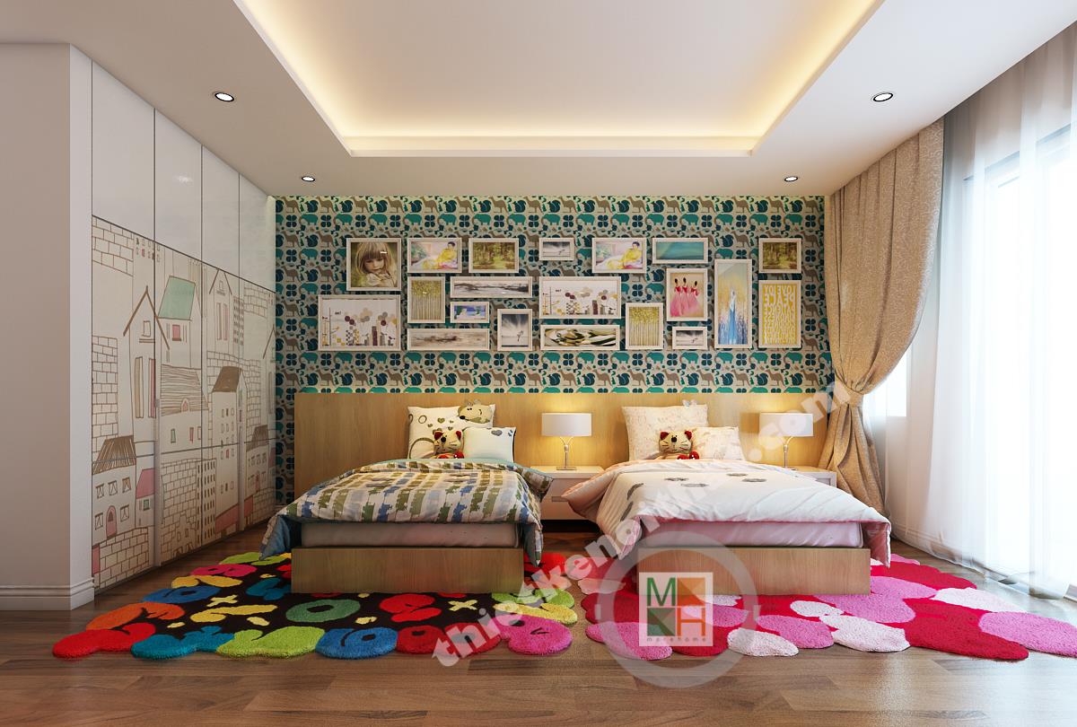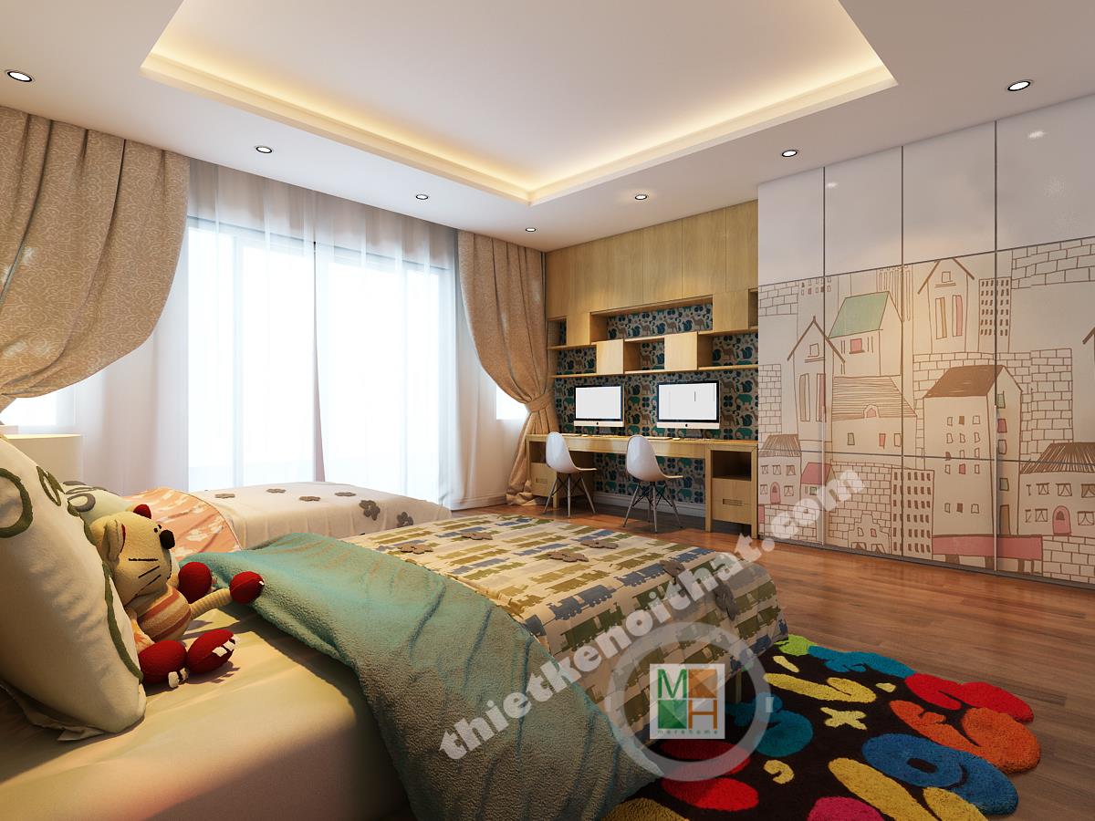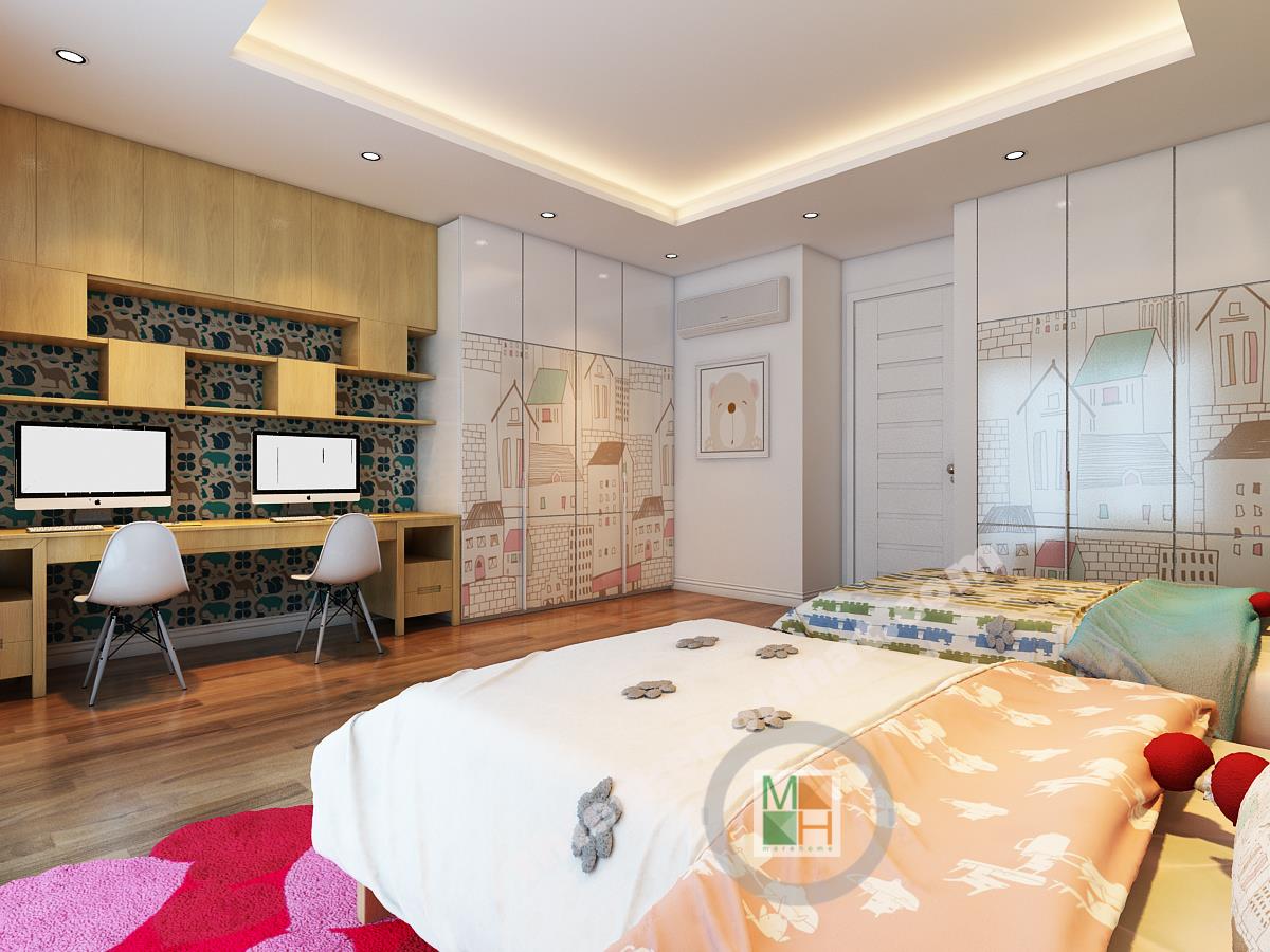 Phòng ngủ của hai con bố trí hai giường gần nhau để các bé có thể cùng chơi đùa và trò chuyện. Bàn học cũng được thiết kế liền nhau vừa giúp tiện kiệm diện tích và cũng thể hiện được sự gắn kết giữa hai bé. Đồ đạc trong phòng được lựa chọn có màu sắc vui nhộn và sinh động, phù hợp với lứa tuổi của con. Tủ quần áo được thiết kế âm tường để có thêm diện tích tích trữ và diện tích để các bé có thể vận động, vui chơi.