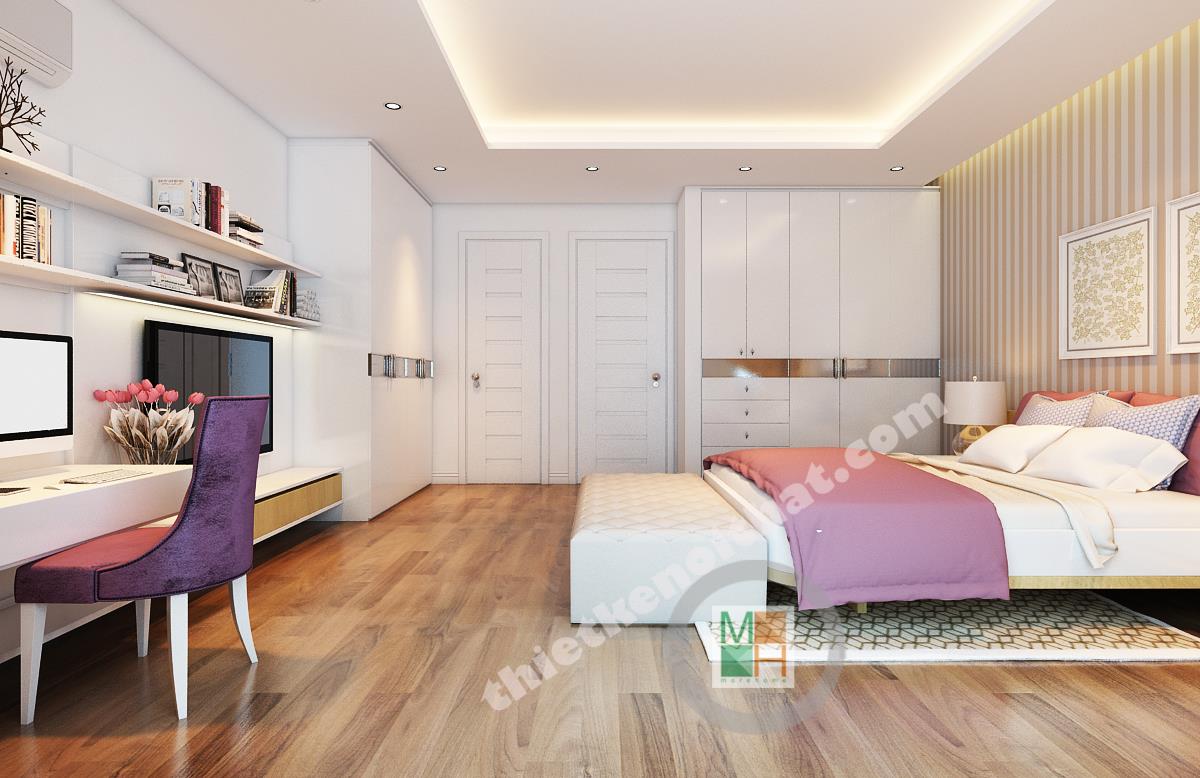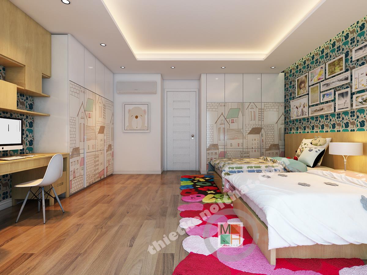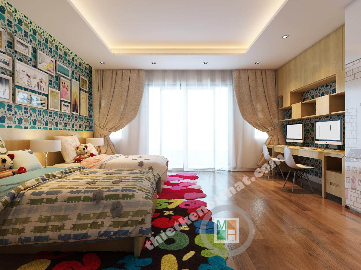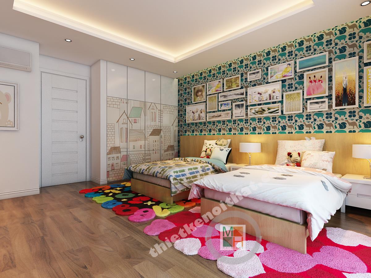 Phòng ngủ của hai con bố trí hai giường gần nhau để các bé có thể cùng chơi đùa và trò chuyện. Bàn học cũng được thiết kế liền nhau vừa giúp tiện kiệm diện tích và cũng thể hiện được sự gắn kết giữa hai bé. Đồ đạc trong phòng được lựa chọn có màu sắc vui nhộn và sinh động, phù hợp với lứa tuổi của con. Tủ quần áo được thiết kế âm tường để có thêm diện tích tích trữ và diện tích để các bé có thể vận động, vui chơi.
