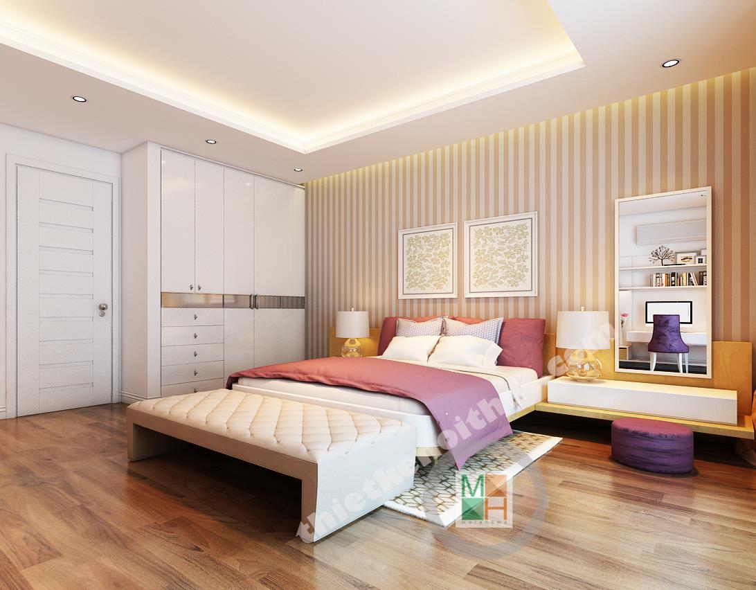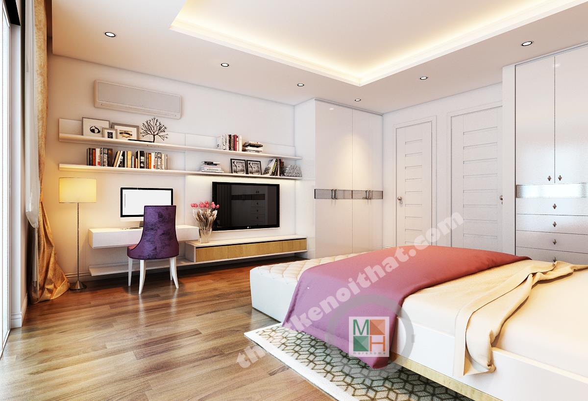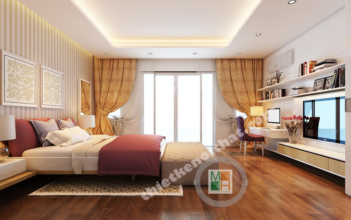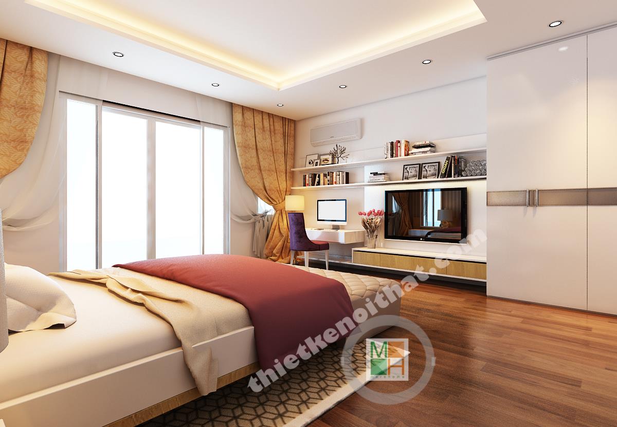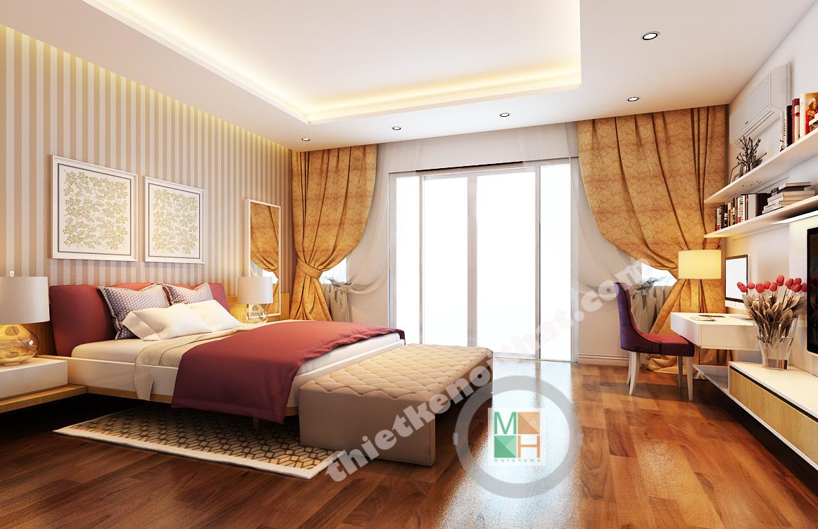 Phòng ngủ sử dụng sàn gỗ nâu đối lập với màu tường trắng khiến căn phòng trông rộng hơn so với diện tích thực. Trong phòng ngủ chính, đồ nội thất được sắp đặt để tạo cảm giác chắc chắn, an toàn khi sử dụng. Bên hông phòng là cửa kính dẫn ra ban công nên không gian rất thoáng và đảm bảo đủ sáng. Bàn làm việc được đặt sát cửa sổ để tận dụng ánh sáng từ bên ngoài và đón gió trời.