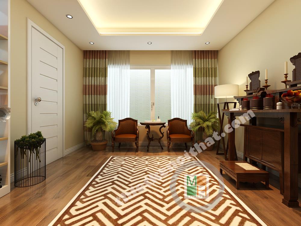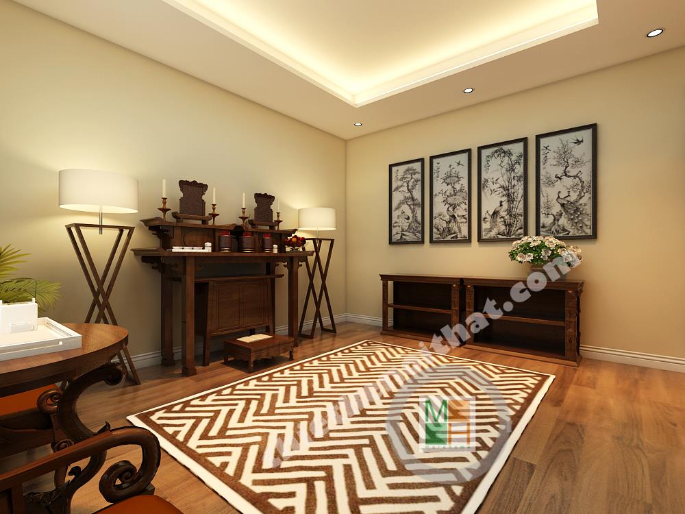 Phòng thờ sử dụng nội thất gỗ sẫm màu để thể hiện sự tôn nghiêm, thành kính. Bàn thờ và những chiếc ghế trong phòng có những đường nét chạm khắc mang đậm phong cách Á đông. Trên mảng tường trống, những bức tranh thêu tứ quý giúp xóa đi sự ảm đạm và thể hiện gia chủ là người có con mắt nghệ thuật.