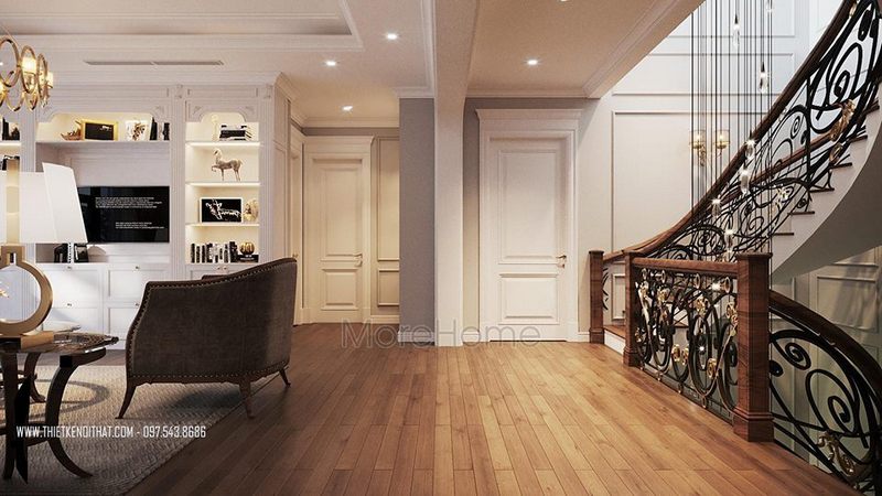 Đẳng cấp - ấn tượng- sang trọng là những gì bạn có thể cảm nhận được trong mẫu thiết kế nội thất phòng khách biệt thự, nhà phố từ gỗ óc chó nâu quý trên đây của MoreHome