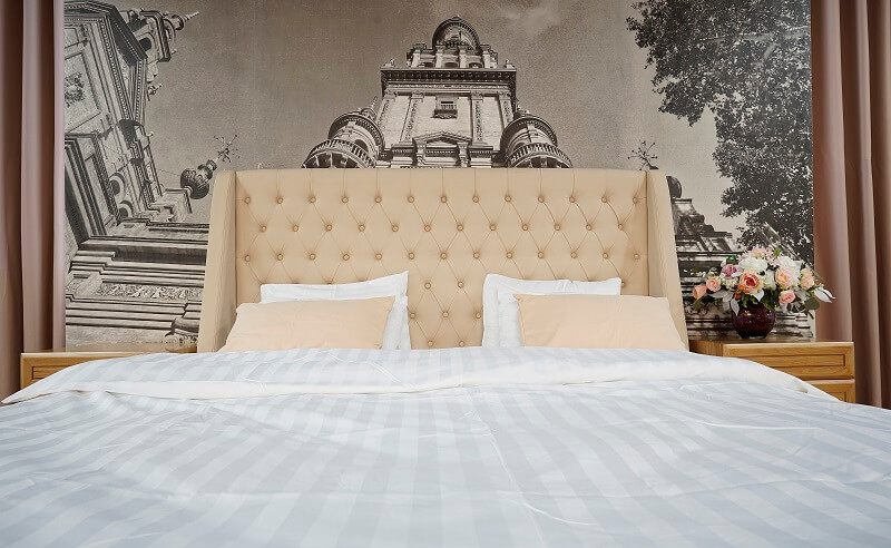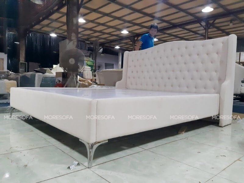 Giường ngủ hiện đại với bọc nỉ màu trắng tạo nên một múi cách điệu không thể bỏ qua ở đầu giường.