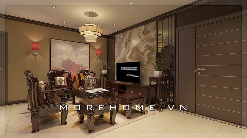 Bàn trà gỗ tự nhiên với kiểu dáng tinh tế, hình chứ nhật và đường nét ấn tượng góp phần tạo nên sự sang trọng cho không gian phòng khách.