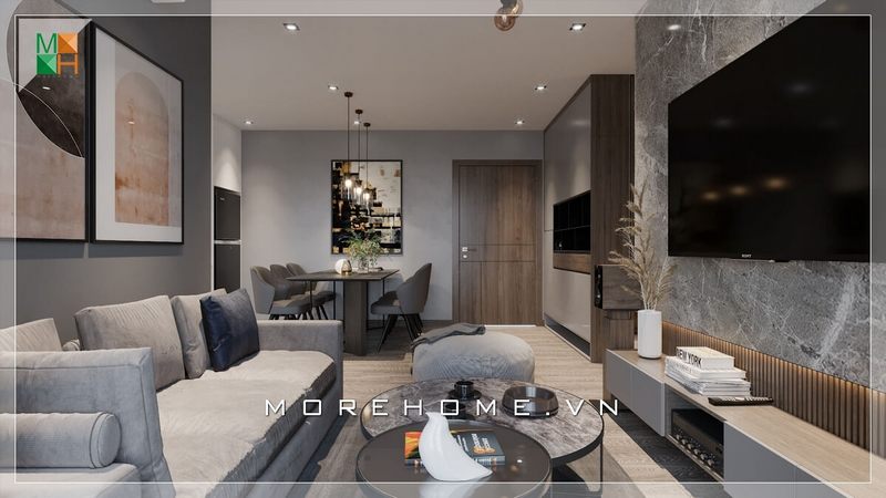 Vẻ đẹp lịch lãm, nhẹ nhàng của phòng khách căn hộ chung cư được tạo nên bởi bộ sofa bọc vải màu trắng xám tinh tế và khung gỗ óc chó nâu ấn tượng.