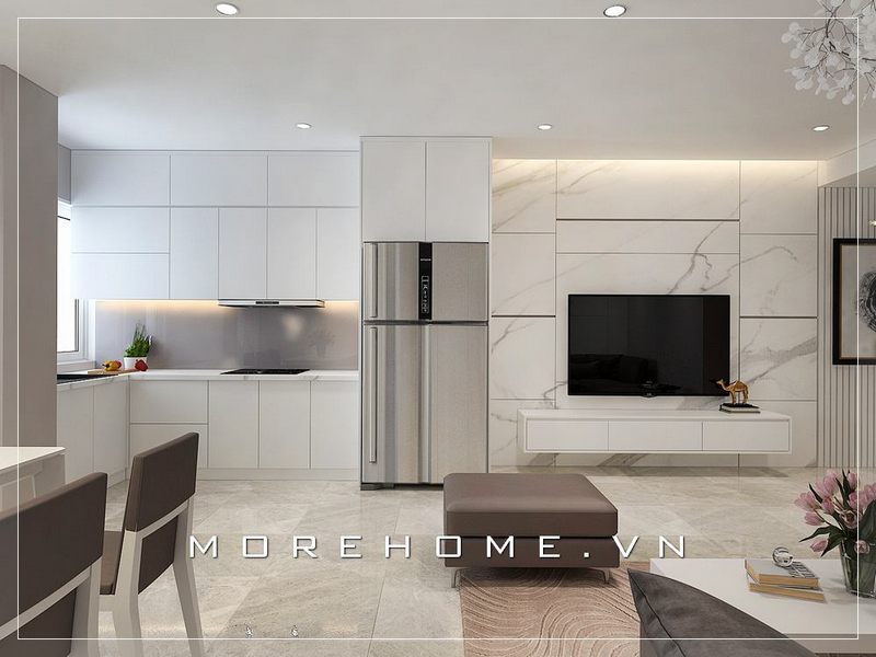 Mẫu thiết kế nội thất hiện đại có không gian liền mạch giữa các phòng, từ phòng ăn liền bếp đến phòng khách, giúp gia chủ dễ dàng di chuyển và sử dụng. Nó phù hợp với các không gian nhà phố sang trọng, biệt thự đẳng cấp và chung cư cao cấp.