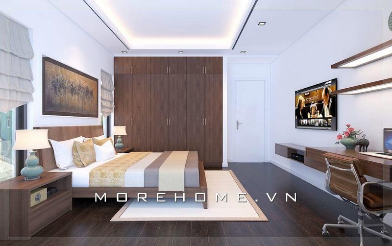 . Mẫu thiết kế nội thất phòng ngủ chung cư hiện đại và tinh tế, bao gồm tủ quần áo kịch trần, kệ ti vi treo tường, được coi là lựa chọn hoàn hảo cho gia chủ trong không gian này.